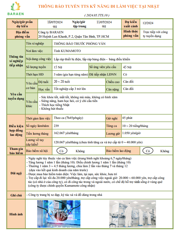 TUYỂN 15 NỮ THỰC TẬP SINH LẮP RÁP THIẾT BỊ ĐIỆN